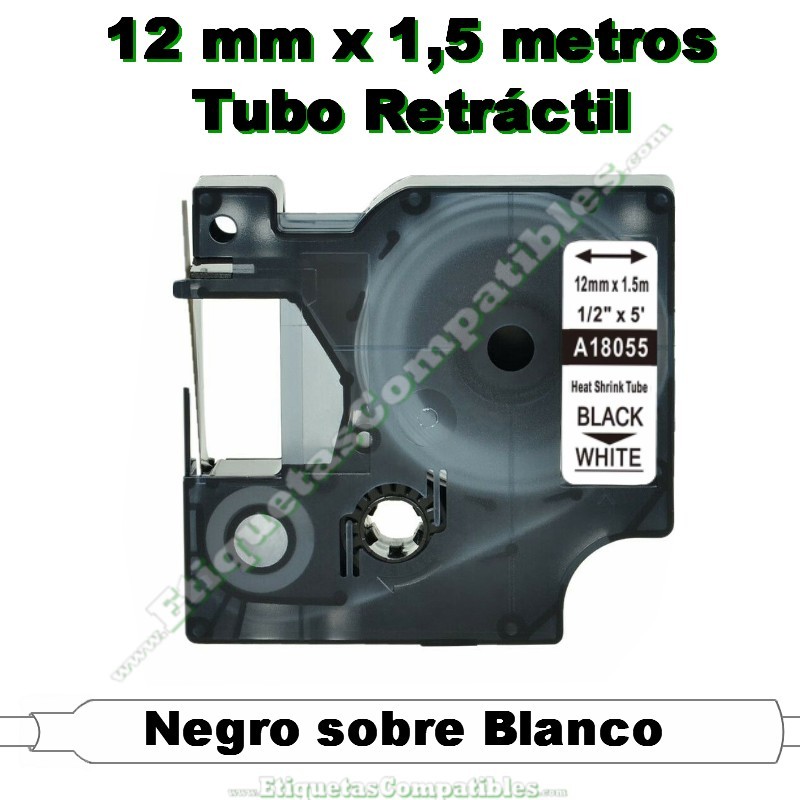Cinta de Etiquetas Compatibles con Dymo Rhino 18055 / S0718300 (No son originales) de 12 mm x 1,5 metros con impresión en Negro sobre Tubo Retráctil Blanco.